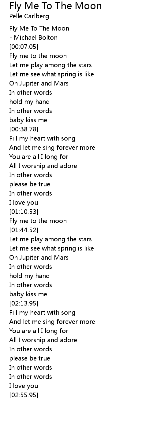 The Macarons Project - Fly Me To The Moon (lyric video) Song: Fly Me To The Moon - The Macarons Project lyrics Indie pop . Fly Me To The Moon Lyrics are a theme that is being searched for and favored by netizens these days. You can Download the Fly Me To The Moon Lyrics here. Download all royalty-free pics. Fly me to the moon - Frank Sinatra (Lyrics), Fly me to the moon - Frank Sinatra (Lyrics) Fly me to the moon Let me play among the stars Let me see what spring is like On a, .
